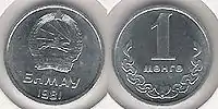 - 1970, 1977, 1980, 1981 (1-5 мунгу — алюминий, 10-50 — медно-никелевый сплав). Прежние монеты были изъяты из обращения.