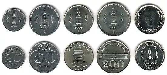 | Банкноты | 1, 5, 10, 20, 50, 100, 500, 1000, 5000, 10 000, 20 000 тугриков [1] |