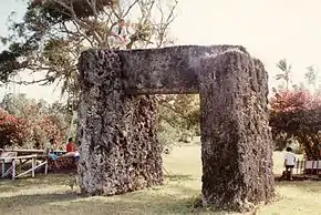 Также бытует версия, что Хаамонга-а-Мауи могло служить в качестве входа на существовавшую здесь в прошлом королевскую территорию древней столицы Тонга[3]. Косвенно это подтверждается легендой, рассказанной историографом королевской семьи (Tamale of Haameniuli) в начале XX века, что всякий, пройдя арку и углубившись на королевскую территорию примерно на 100 метров, приближался к трону 'esi Maka Fa’akinanga (в переводе с тонганского — «камень, чтобы прислониться к»), где располагался король и спинка которого, имеющая углубления для головы, плеч и спины, сохранилась до наших дней[4]. Интересно, что Королевство Тонги не обладало письменностью. Поэтому его история хранилась в памяти специально определенной для этого семьи. Её представитель, королевский историограф (Tamale of Haameniuli), в начале XX века и поведал историю строительства[4].