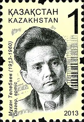 ![]() Мукан Тулебаев на почтовой марке Казахстана, 2013 | |