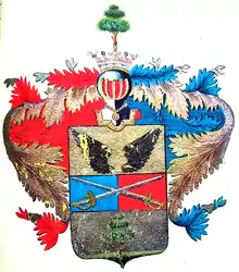 Щит увенчан дворянскими шлемом и короной. Нашлемник: такое же, как в щите, дерево. Намёт на щите красный и голубой, подложенный золотом.