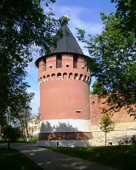 Проездные башни закрывались мощными дубовыми воротами и опускавшимися железными решетками, так называемыми «герсами». В толще башенных стен шли обходные галереи, имеющие бойницы не только в сторону поля, но и во внутрь башни. Из этих галерей, соединенных проходом с боевым ходом стен, защитники крепости могли обстреливать врага, если бы ему удалось ворваться в башню, пробив дубовые ворота и сломав герсы. Обособленные входы в нижние ярусы глухих башен имели оборонное значение: вражеским отрядам, даже ворвавшимся в кремль, пришлось бы овладевать каждой башней как самостоятельной цитаделью. Все башни завершались рядами двурогих зубцов той же высоты и устройства, что и на стенах. Над башнями возвышались высокие деревянные шатры, крытые двойным тёсом.