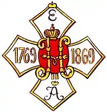 - юбилейное простое знамя с юбилейной александровской лентой «1769-1869» (пожаловано 1-му батальону);