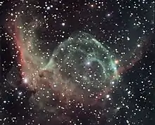 Другой тип туманностей, созданных ударными волнами связан со звёздным ветром от звёзд Вольфа — Райе. Эти звёзды характеризуются очень мощным звёздным ветром с потоком массы в год и скоростью истечения 1⋅103—3⋅103 км/с. Они создают туманности размером в несколько парсек с яркими волокнами на границе астросферы такой звёзды. В отличие от остатков вспышек сверхновых звёзд, радиоизлучение этих туманностей имеет тепловую природу. Время жизни таких туманностей ограничено продолжительностью пребывания звёзд в стадии звезды Вольфа — Райе и близко к 105 лет.