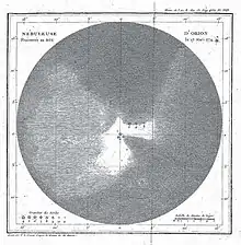 В 1865 году Уильям Хаггинс с помощью спектроскопических наблюдений сделал вывод, что туманность состоит из светящегося газа. В 1880 году Генри Дрейпер впервые сделал фотографию Туманности Ориона, которая стала первой фотографией туманности в истории[7][21].