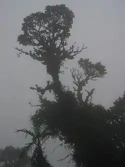 По сравнению с тропическими влажными лесами, расположенными ниже, туманные леса демонстрируют уменьшенный рост деревьев в сочетании с повышенной плотностью стволов и в целом более низким разнообразием древесных растений.[7][8] Деревья в этих регионах, как правило, короче и имеют более сильный ствол, чем в лесах на более низкой высоте в тех же регионах, часто с корявыми стволами и ветвями, образующими густые компактные кроны. Их листья становятся меньше, толще и тверже с увеличением высоты.[11] Высокая влажность способствует развитию высокой биомассы и биоразнообразия эпифитов, особенно мохообразных, лишайников, папоротников (включая пленчатолистные папоротники), бромелиевых и орхидей.[7][8] Количество эндемичных растений может быть очень большим.[7]