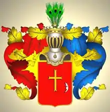 В щите имеющем червлёное поле, изображён золотой крест и внизу с левой стороны серебряный полумесяц, рогами к кресту обращённый.
