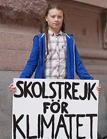 В августе 2018 года, когда ей было 15 лет, Тунберг начала протестовать возле шведского парламента с плакатом «Skolstrejk för klimatet» (со швед. — «Школьная забастовка за климат»), призывая к незамедлительным действиям по борьбе с экологическими проблемами. Её действия нашли отклик по всему миру, породив массовые мероприятия, известные как «Пятницы ради будущего»[9][10][11]. В том же году Тунберг выступила на конференции ООН по изменению климата. В 2019 году были проведены акции протеста в разных городах с участием более чем миллиона людей[12]. Её фраза «Как вы смеете», произнесённая на саммите ООН по изменению климата в 2019 году, была широко освещена в прессе и Интернете.