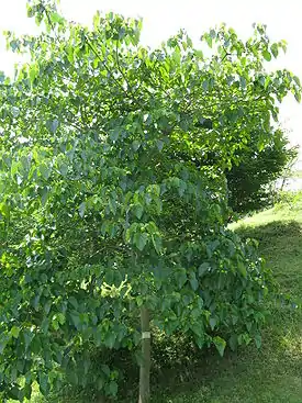 Листья очерёдные кожистые голые, с длинными черешками, сердцевидные или широкояйцевидные, 7—20 см длиной.