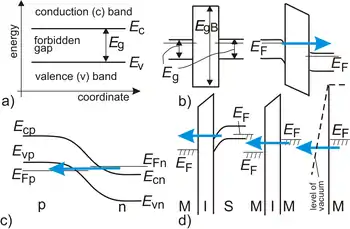 Важным случаем туннелирования является перенос электронов в структурах, содержащих полупроводниковые или диэлектрические слои. Как известно из зонной теории твёрдого тела, электрон в таких материалах может иметь не любую энергию, а только ниже некоторого значения или выше некоторого другого Область называется запрещённой и обычно составляет несколько эВ. В однородном материале без приложения электрического напряжения профили являются горизонтальными линиями (на рисунке — а). Однако, при наличии нескольких слоёв возникают скачки и на стыках, то есть создаётся барьер (на рисунке — b, d). Барьеры также могут возникать или изменяться в присутствии электрического поля, вызывающего изгиб/наклон (на рисунке — с). Для протекания туннельного тока необходимо наличие разницы в энергиях Ферми слева и справа от барьера.