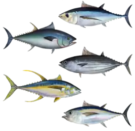 ![]() Сверху вниз: длиннопёрый тунец, обыкновенный тунец, полосатый тунец, желтопёрый и большеглазый тунец | ||||||||||