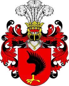 В поле червлёном поднятое вверх ястребиное или орлиное чёрное крыло с золотой лапой. Коленом она обращёна в правую сторону щита. Герб этот выводят из Венгрии, откуда он перенесён в Польшу при Казимире Великом или его наследнике Людовике Венгерском[1].