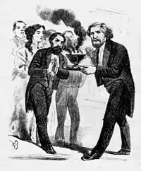 Однако, Достоевский в романе «Бесы» изобразил Тургенева в виде «великого писателя Кармазинова» — крикливого, мелкого, исписавшегося и практически бездарного литератора, считающего себя гением и отсиживающегося за границей[61][~ 9]. Подобное отношение к Тургеневу вечно нуждавшегося Достоевского было вызвано в том числе обеспеченным положением Тургенева в его дворянском быту и самыми по тем временам высокими литературными гонорарами: «Тургеневу за его „Дворянское гнездо“ (я наконец прочёл. Чрезвычайно хорошо) сам Катков (у которого я прошу 100 руб. с листа) давал 4000 рублей, то есть по 400 рублей с листа. Друг мой! Я очень хорошо знаю, что я пишу хуже Тургенева, но ведь не слишком же хуже, и наконец, я надеюсь написать совсем не хуже. За что же я-то, с моими нуждами, беру только 100 руб., а Тургенев, у которого 2000 душ, по 400?»[63][64]