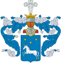В щите, имеющем голубое поле, изображены три золотые шестиугольные звезды и серебряный единорог, имеющий золотые рог и копыта. Щит увенчан дворянскими шлемом и короной с тремя страусовыми перьями. Намёт на щите голубой, подложен серебром.