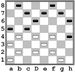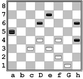 При очереди хода черных взятие дамкой должно быть таким: a5:e1:g3:e5 (шашку белых d4 дамка побить не может, т.к. шашка c3, так же, как и шашки f2 и f4, снимаются с доски лишь по окончании хода), после чего белые играют d4:d8