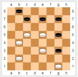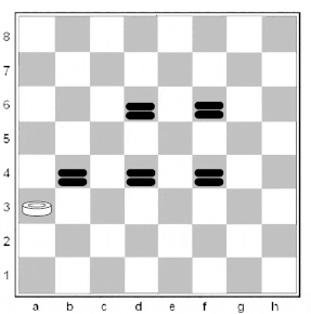Белые при своей очереди хода должны взять дамкой так: е1:а5:d8:f6:d4. На поле d4 дамка должна остановиться, т.к. через шашку c3 второй раз перескакивать нельзя, нельзя также перескакивать и через шашку с5