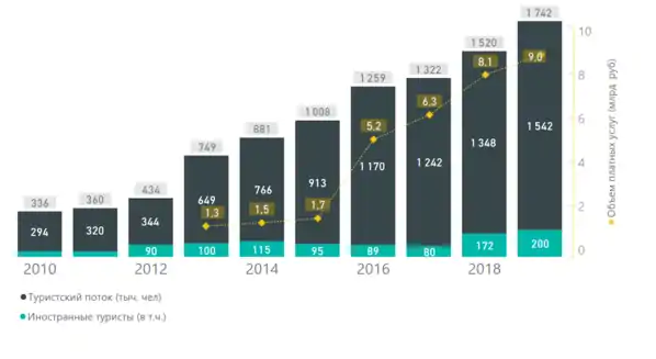 В настоящее время на долю туризма приходится порядка 2% ВРП Калининградской области или в денежном выражении 9 млрд. руб. Рост основных показателей развития региональной сферы туризма с 2013 года – 10-12% ежегодно. По итогам 2019 года въездной туристский поток в регион составил 1,74 млн человек, в том числе более 200 тыс. иностранных граждан. В 2020 году, по причине пандемии Covid-19, этот показатель составил 1,2 млн человек. Наиболее популярными в регионе являются культурно-познавательный, пляжный и деловой виды туризма. Прибытия туристов по видам транспорта распределяются следующим образом: 60% – авиа-; 25% – авто-, мото-, вело-; 15% – ж/д[14]. На калининградском рынке представлена 321 туркомпания, в том числе 50 туроператоров, включенный в Единый федеральный реестр. Всего в туристической отрасли региона занято порядка 13 тыс. человек. Средняя зарплата в сфере туризма в 2020 году составила около 37 тыс. рублей.