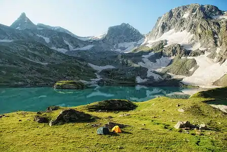 Туристические палатки на берегу большого Имеретинского озера