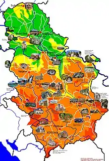 Сербия располагается на стыке двух географических и культурных регионов Европы. Это Центральная Европа (Среднедунайская низменность) и Юго-Восточная Европа (Балканский полуостров).[1] Разнообразие ландшафтных и культурно-исторических памятников, спа-курорты, охотничьи угодья и рыбалка формируют туристический облик Сербии. Международные автомагистрали и железнодорожные линии, проходящие по территории Сербии, связывают Западную и Центральную Европу с Грецией, Турцией, Ближним Востоком, Азией и Африкой. Воздушные коридоры, связывающие Запад и Восток, Север и Юг, также проходят над этой страной.