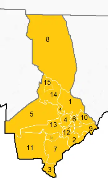 Районы: 1. Байдибекский, 2. Казыгуртский, 3. Мактааральский (включая Жетысайский), 4. Ордабасынский, 5. Отрарский, 6. Сайрамский, 7. Сарыагашский (включая Келесский), 8. Сузакский, 9. Толебийский, 10. Тюлькубасский, 11. Шардаринский,
