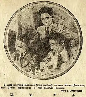 ![]() Группа молодых казахских литераторов, в центре поэт Утебай Турманжанов («Комсомольская правда», 02.04.1936) | |