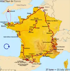 61-й выпуск Тур де Франс — шоссейного гранд-тура, который прошёл по дорогам Франции и Испании с 27 июня по 21 июля 1974 года. Старт состоялся в Бресте, а финишировала гонка в Париже последний раз на Велодроме де Винсена.