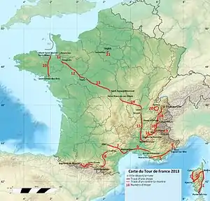Тур де Франс 2013 является 100-м Тур де Франс в истории[3]. Тур стартовал на Корсике в городе Порто-Веккио, остров принял три первых этапа[4][5]. Корсика является единственным европейским регионом Франции, где ещё ни разу не проходил Тур де Франс, и организаторы решили объединить столетие Тура и его появление на Корсике.