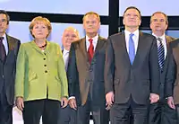 Дональд Туск, Ангела Меркель и Жозе Мануэл Баррозу на конгрессе Европейской народной партии в Варшаве, 29 апреля 2009 года