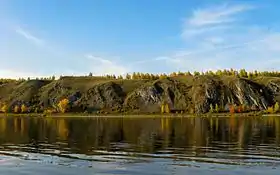 ![]() Вид на Тутальские скалы с противоположного (левого) берега реки Томи | |