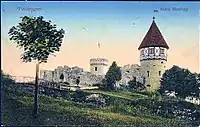 Плодоовощехранилище и тюремная башня на заднем плане.