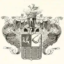 Щит увенчан дворянскими шлемом и короной. Нашлемник: из облака выходящий до половины гриф. Намёт на щите голубой и красный, подложенный золотом.