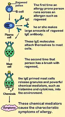 Сигнальный путь, активирующийся при кросс-связывании FcεR1 с аллергеном при участии IgE, очень похож на тот, который запускается при активации лимфоцитов антигенами. С цитоплазматической частью β-цепи FcεR1 связана тирозинкиназа Lyn, и после кросс-связывания FcεR1 с аллергеном она фосфорилирует мотивы ITAM в β- и γ-цепях FcεR1. Другая тирозинкиназа, Syk, связывается с фосфорилированными ITAM в γ-цепях и активируется[14], фосфорилируя множество других белков и активируя их, тем самым увеличивая сигнал[15].