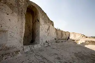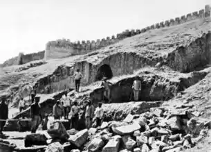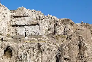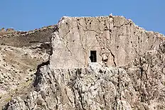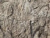 | Участок южного склона Ванской скалы Слева: вход в пещеры «Нафт-кую» — высеченные в скале помещения, вероятно, для царских нужд. Справа остатки одной из сторожевых башен урартской крепости, выше которой видны остатки поздней кирпичной кладки. | «Площадь» с летописью Сардури II, расположенная на северном склоне Ванской скалы, рядом с восточными («Тавризскими») воротами. Площадка была раскрыта в результате археологических раскопок Русского археологического общества в 1916 году. |