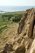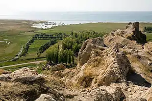 | Вид на Ванскую скалу со стороны озера Ван. В связи с тем, что западная часть скалы ниже центральной, на западной стороне была сооружена мощная крепостная башня. Слева от башни располагались главные ворота цитадели. | Вид на озеро Ван с середины Ванской скалы — с этой точки видели озеро урартские цари, когда выходили из своих апартаментов. Ручей, протекающий слева внизу — остатки неиспользуемой воды канала Менуа, стекающие в озеро. |