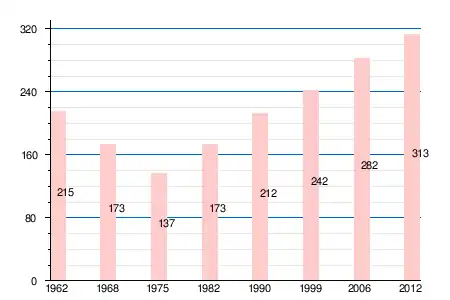 | 1962 | 1968 | 1975 | 1982 | 1990 | 1999 | 2005 | 2006 | 2010 | 2011 | 2012 |