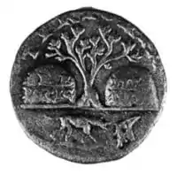Древнеримская монета с изображением моллюска для крашения (на реверсе справа внизу)