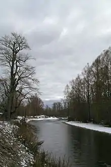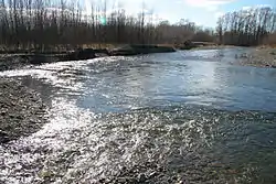 Вид вверх по течению с правого берега реки Тымь в посёлке Ноглики.