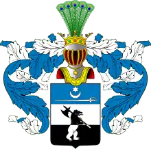 Щит разделён горизонтально на три части, из них в верхней в голубом поле изображены: серебряная шестиугольная звезда и под нею того же металла луна, рогами вверх и меч остриём в правую сторону обращённые, в средней серебряной и нижней чёрной частях, поставлен медведь с секирой переменных с полями цветов.