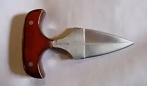 Положение ножа в руке: рукоять зажата пальцами, между двумя пальцами проходит пята , а лезвие остается торчать на внешней стороне кулака. Лезвие тычкового ножа с Т-образной рукоятью при этом зажимается между средним и безымянным пальцами руки, лезвие ножа с Г-образной рукоятью — между средним и указательным пальцами. Благодаря компактным размерам тычковый нож удобен для скрытного ношения. Есть варианты данного ножа, замаскированные под пряжку брючного ремня либо плоские, которые можно спрятать в кошельке или бумажнике.