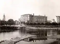 Желая завоевать прочные позиции в среде виленской аристократии и подчеркнуть собственный статус, графиня озаботилась возведением персональной городской резиденции[7]. Образцом для подражания Тышкевич служила княжна Мария Клементина Сангушко — графиня жаждала занять в Вильне такое же положение, какое занимала в Лемберге её мать[8]. Дворец Клементины Тышкевич был построен в 1884—1888 годах на берегу реки Вилия по проекту выпускника Императорской Академии художеств в Санкт-Петербурге Киприана Мацулевича. Земельный участок под резиденцию графини был приобретён 5 (17) декабря 1883 года у Владимира Джулиани[4][9]. Оригинальная структура здания не имеет аналогов в Вильне: двухэтажные корпуса дворца развёрнуты вдоль направленности двух улиц, а помещённая между корпусами часть строения имеет форму трапеции и включает в себя вестибюль с парадной лестницей. Экстерьер угловой части дворца выделяется благодаря широкой лоджии c рядом колонн. Лоджия была предназначена для того, чтобы кареты гостей графини могли подъезжать непосредственно к дверям центрального входа. Оформление фасадов здания из желтоватого кирпича повторяет итальянские ренессансные формы[10][4].