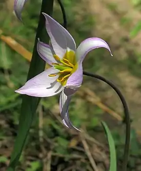 Единственный цветок — поникающий, с заострёнными долями околоцветника, обычно сиреневый, реже жёлтый с пурпурным загаром, основания долей с внутренней стороны жёлтые.