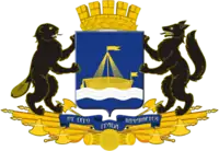 Щит держат чёрные бобр и лис с серебряными глазами и клыками, стоящие на золотом трофее, состоящем из алебард, знамён, барабанов с круглым щитом посредине. Девиз «От сего града начинается» начертан серебром на лазоревой ленте.