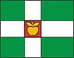 На полотнище зелёного цвета белый крест, в центре которого золотисто-жёлтое яблоко в красном квадрате. Нормальный размер флага 105 × 135 см, соотношение ширины и длины 7:9[5].
