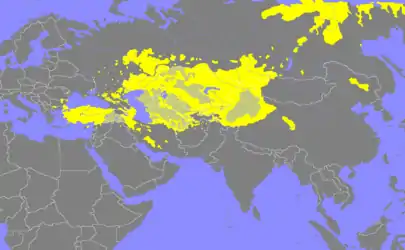 Современные тюркоязычные народы широко распространены за пределами их исторического ареала, подавляющее их большинство проживает в Евразии, на территориях самых разных государств — от Центральной Азии (включая Китай) и Дальнего Востока России[12], и на запад — на Ближнем Востоке, Кавказе, в Восточной и Юго-Восточной Европе.