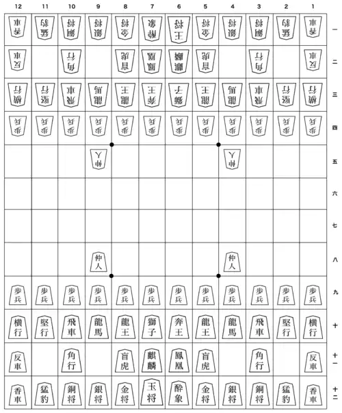 ![]() Тю сёги: снизу начальная расстановка, сверху — перевёрнутые фигуры. | |