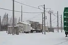 Далее электроэнергия поступает на понижающий трансформатор, откуда она подаётся на преобразовательный агрегат (выпрямитель). С преобразовательного агрегата выпрямленный ток подаётся на основную и резервную системы шин и распределяется в контактную сеть через быстродействующие выключатели.