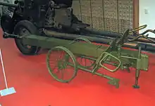 - наличие лафета с раздвижными станинами, колёсным ходом, щитовым прикрытием;