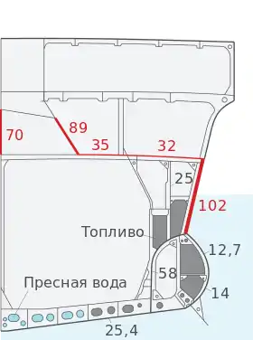 - Защита подводной части корпуса, способная выдержать взрыв 1-2 торпед;