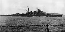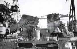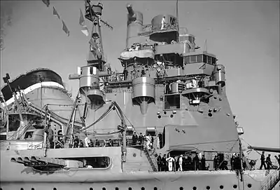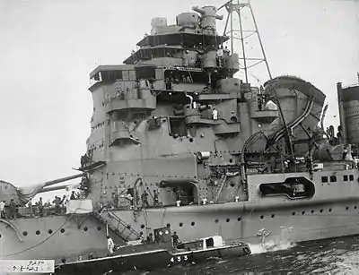 Далее шли четырёхногая фок-мачта и зенитная палуба. На последней размещались две дымовые трубы (носовая — сдвоенная), воздухозаборники вентиляторов машинных и котельных отделений, вторая мастерская и 120-мм зенитные орудия[12]. За ними находились трёхногая грот-мачта с грузовой стрелой, две катапульты и ангар гидросамолётов, на крыше которого размещались резервные пост с визиром центральной наводки и радиорубка. Ещё дальше в сторону кормы шли две двухорудийные башни ГК[13]. Спасательные средства были представлены одним 8-м и одним 9-м сампанами, двумя 9-м гребными, двумя 11-м и тремя 12-м моторными катерами[14].