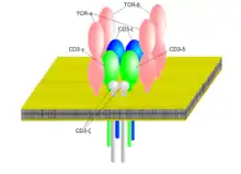 Субъединицы ТКР агрегированы с мембранным полипептидным комплексом CD3. CD3 образован четырьмя типами полипептидов — γ, δ, ε и ζ. Субъединицы γ, δ и ε кодируются тесно сцепленными генами и имеют схожую структуру. Каждая из них образована одним константным иммуноглобулиновым доменом, трансмембранным сегментом и длинной (до 40 аминокислотных остатков) цитоплазматической частью. Цепь ζ имеет маленький внеклеточный домен, трансмембранный сегмент, и большой цитоплазматический домен. Иногда вместо цепи ζ в состав комплекса входит цепь η — более длинный продукт того же гена, полученный путём альтернативного сплайсинга.
